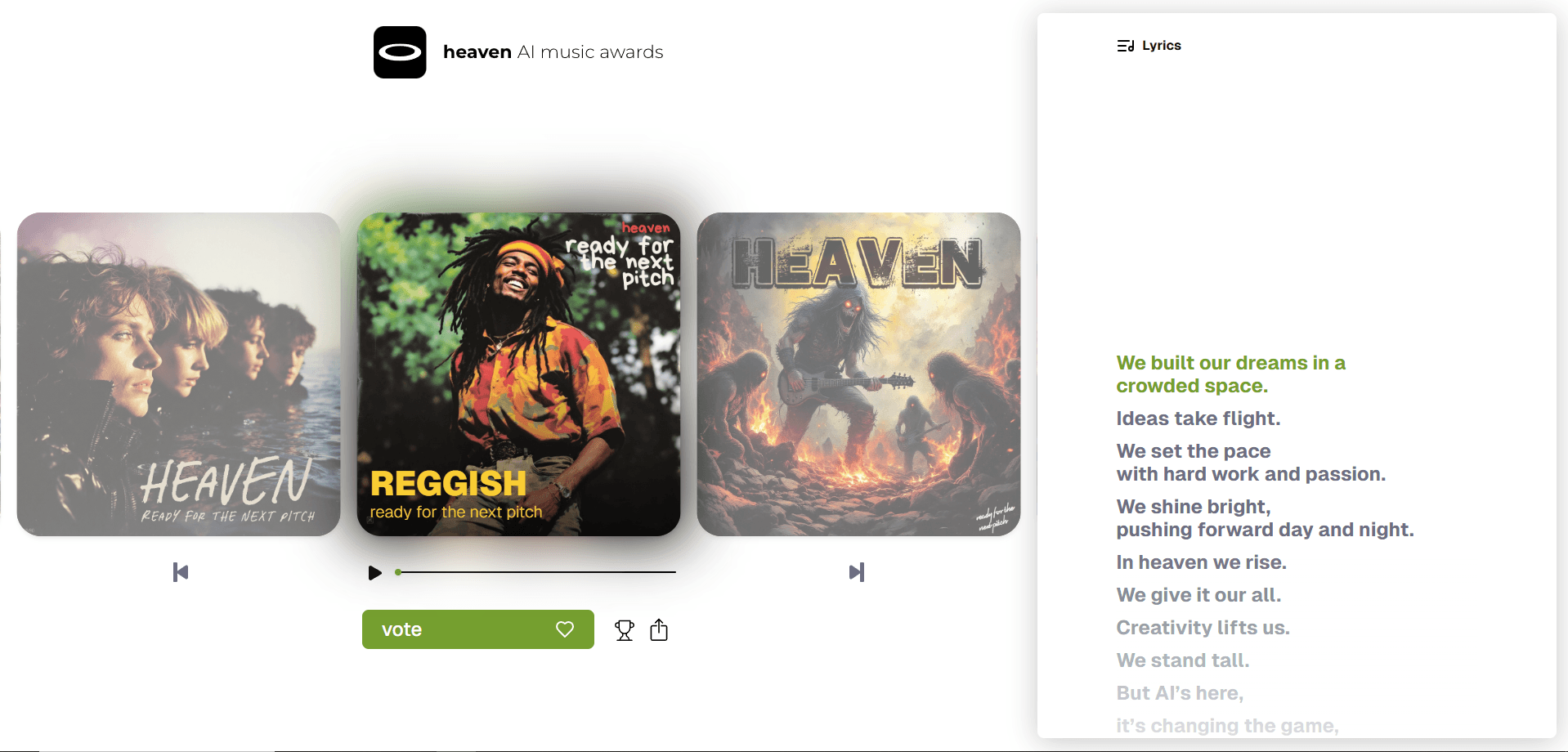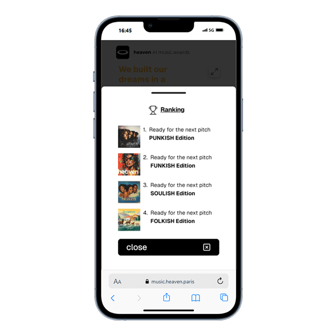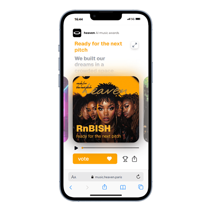 Heaven Music Awards is a website developed for the agency Heaven, designed to showcase its expertise in AI-assisted music generation. The site highlights 13 AI-generated tracks, demonstrating the creative potential of this technology. Built with React, the project incorporates several modern libraries to deliver a smooth and immersive experience: Tailwind for styling, Framer Motion and GSAP for animations, and Zustand for state management. The website is also available as a Progressive Web App (PWA), ensuring optimal accessibility across all devices.