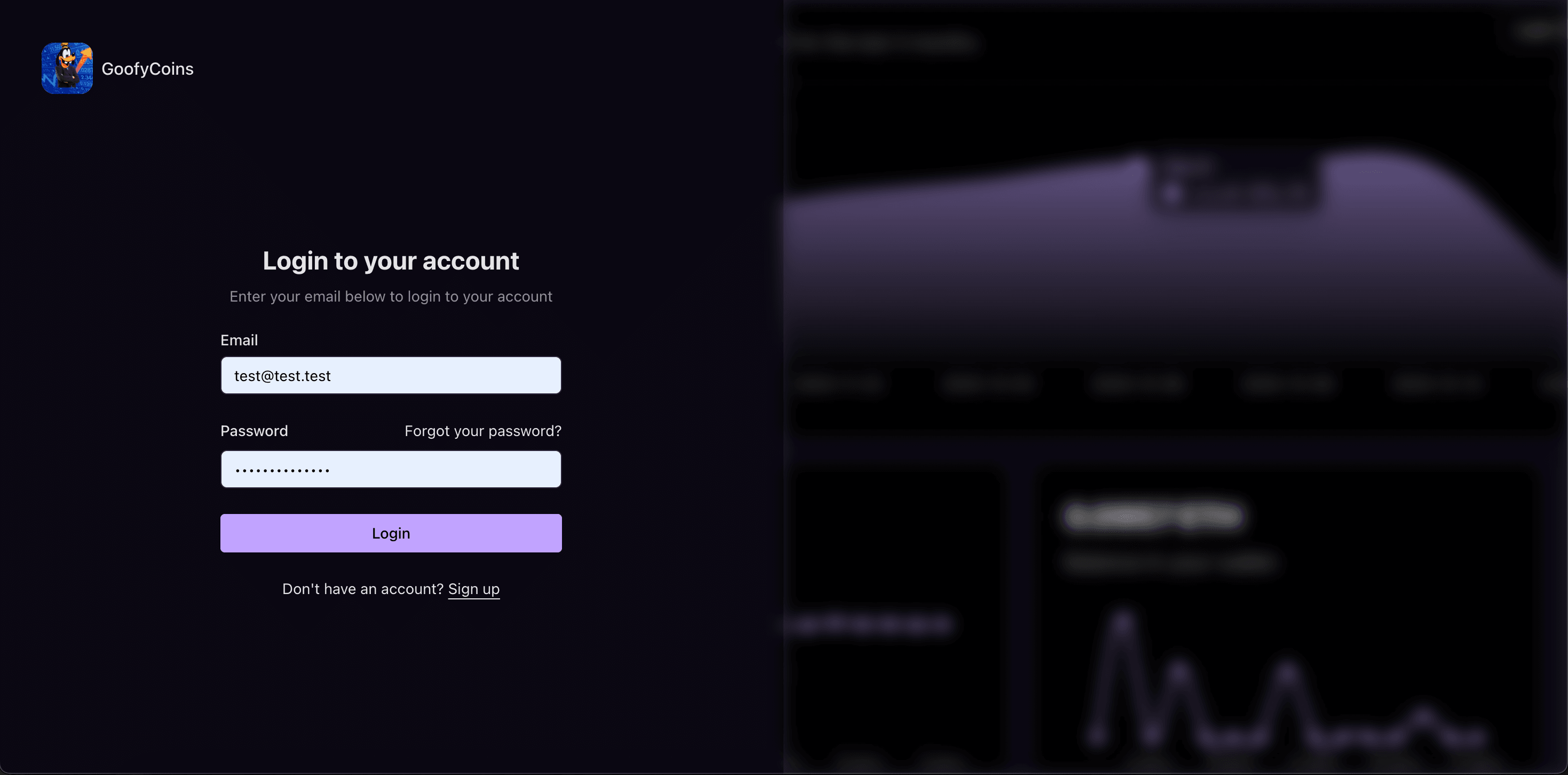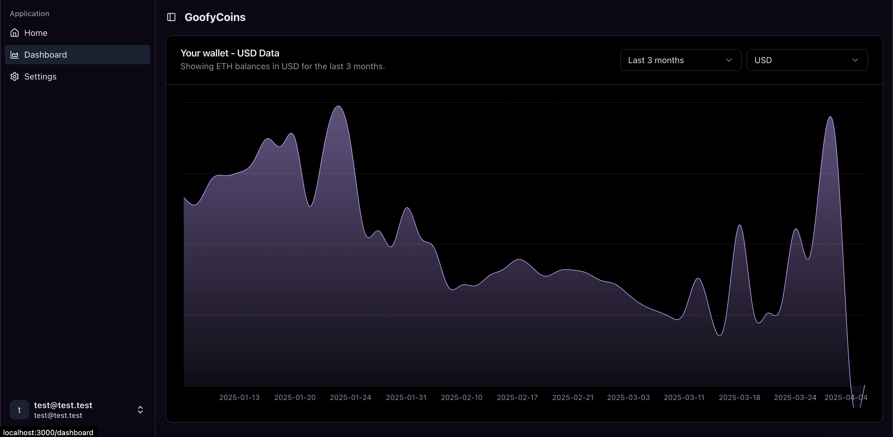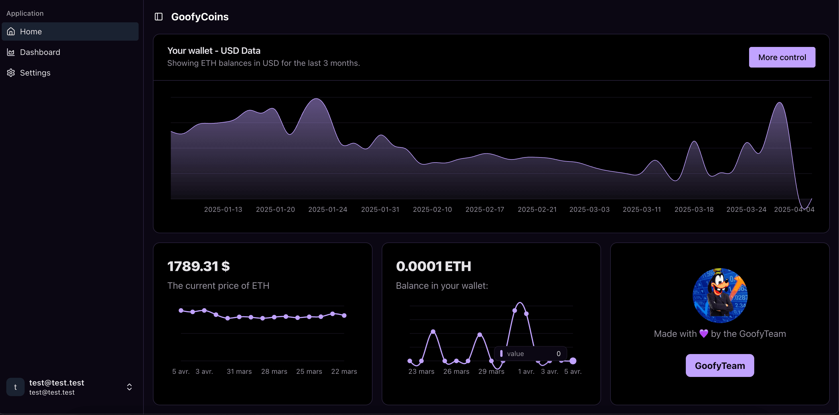 GoofyCoin is a school project in which we developed a React dashboard. This dashboard fetches data from an API and displays it in a clear and interactive way. I handled both the design and frontend development, ensuring a modern, responsive user interface.